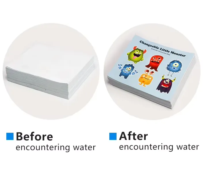 Wystarczy niewielka kropla wody, aby aktywować reakcję etykiety. Lekkie i przenośne etykiety można formować w różne formy, takie jak karty i natychmiastowe wydruki w stylu fotograficznym.Pakiet JOJOświadczy usługi dostosowywania, możemy drukować na etykietach wzory kreskówek, logo marki, treści promocyjne i nie tylko. Idealnie nadają się do świątecznych kartek okolicznościowych, zabawek edukacyjnych dla dzieci, marketingu marki, przeciwdziałania podrabianiu i innych zastosowań.