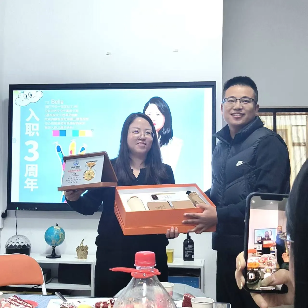 Jako cudowną niespodziankę szef Gao osobiście wręczył Tomowi i Elli oraz menadżerce Belli piękne prezenty z okazji rocznicy pracy. Te specjalne tokeny stanowią szczere uznanie dla ich wkładu w ciągu ostatnich lat i zawierają nasze najlepsze życzenia dalszego rozwoju firmy.