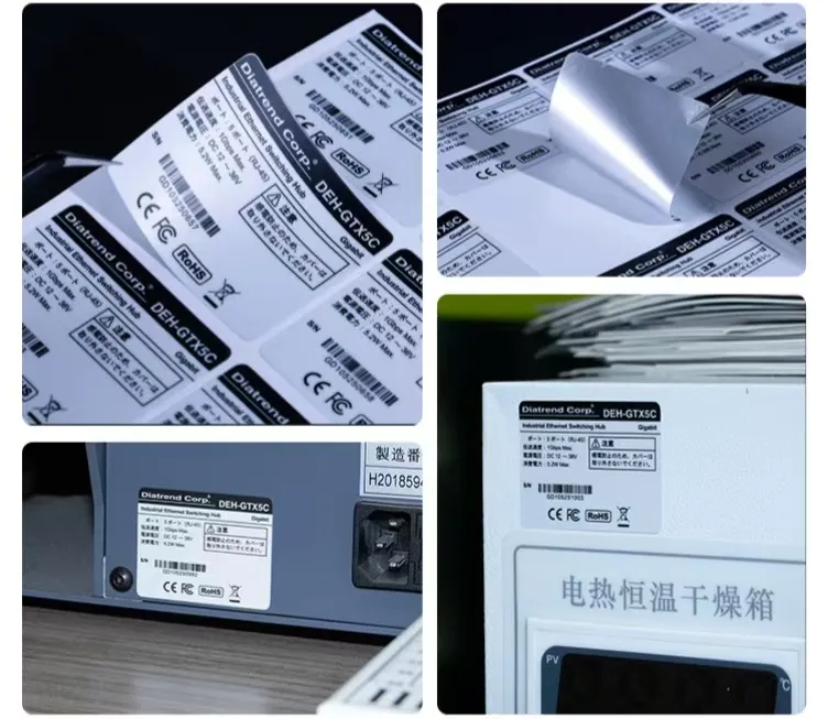 PET biały/matowy srebrny: Odporny na temperaturę do 150 ℃, odpowiedni do tabliczek znamionowych na urządzeniach gospodarstwa domowego i zasilaczach.